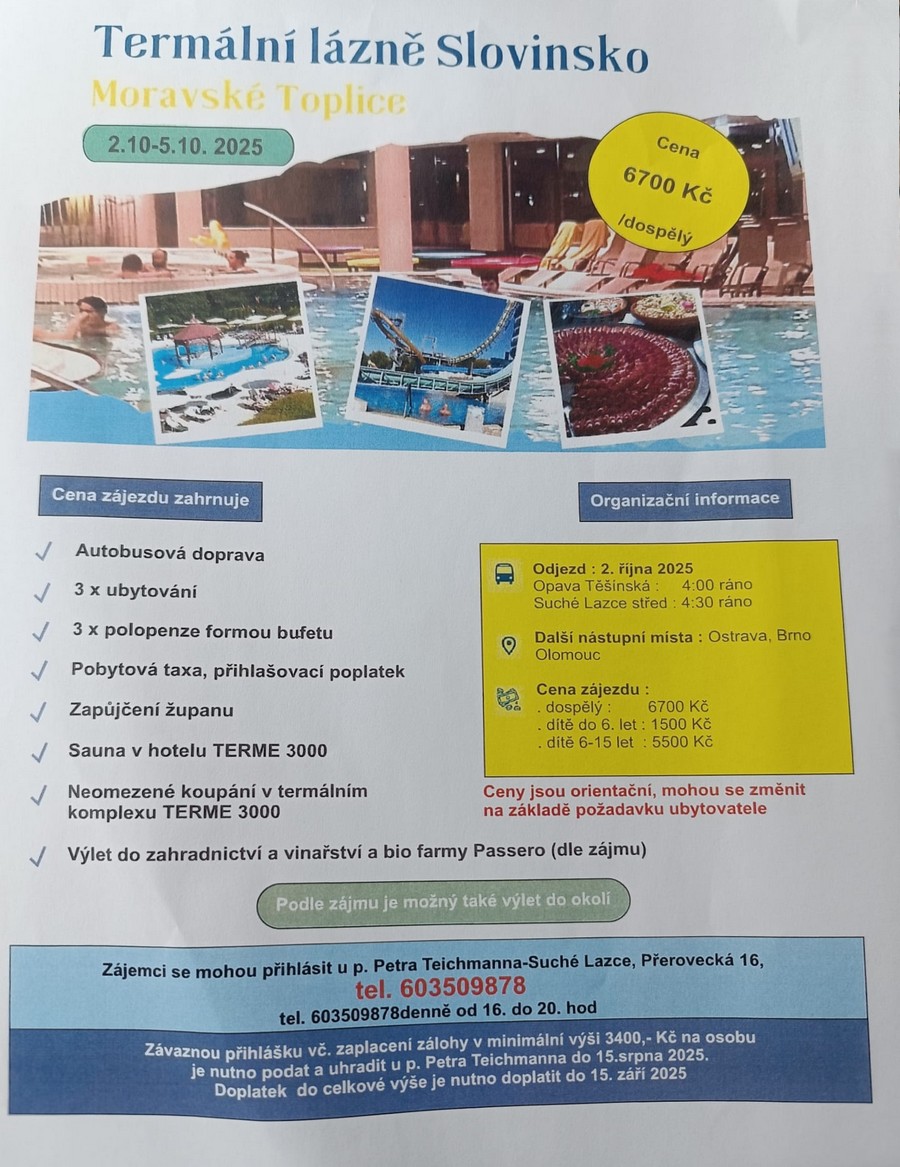 Pokud máte zájem v termínu 2. – 5. 10. 2025 vyrazit do termálních lázní na Slovinsku, tak věnujte pozornost přiloženému letáku. Jsou stále volná místa. Nástupy do autobusu jsou z Opavy, Ostravy, Olomouce a Brna.