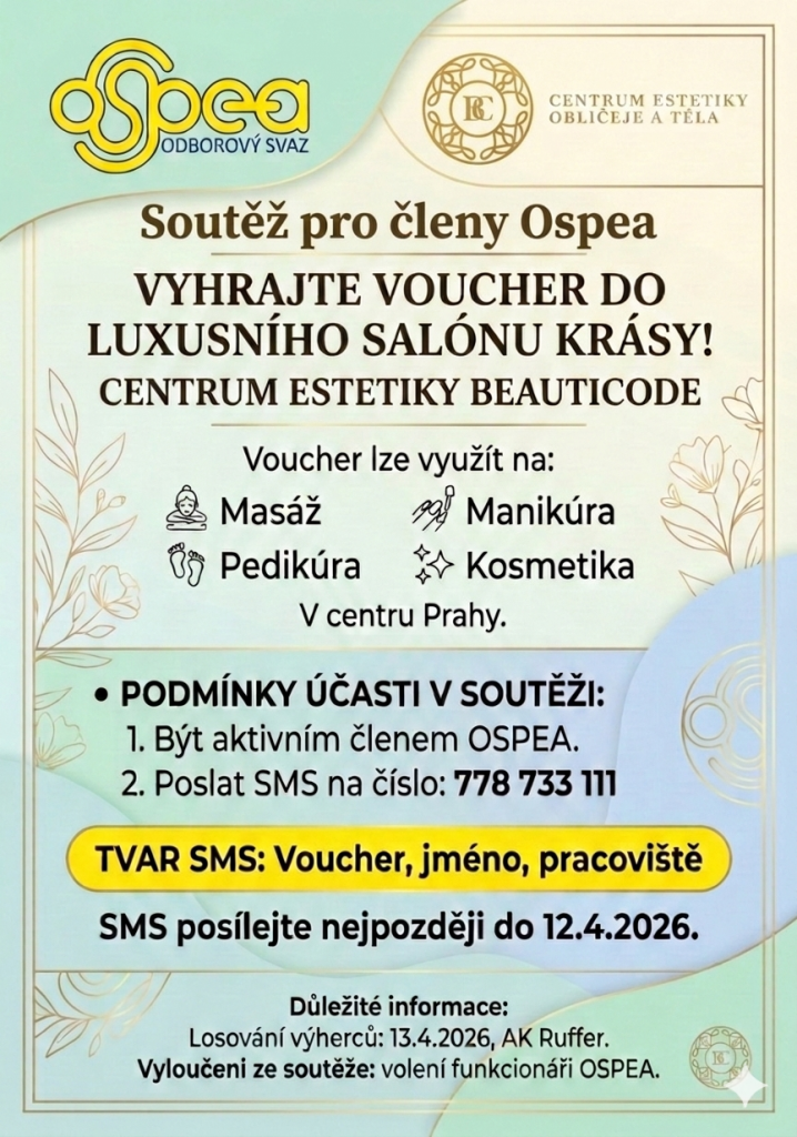 Soutěž o voucher do luxusního salónu krásyaktivní Renáta Humplíková 13. 3. 2026 Akce Ospea Pro všechny členy OSPEA zde máme soutěž o voucher do luxusního salónu krásy v centru Prahy.